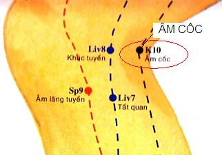 - Lấy ở đầu trong nếp kheo, sau lồi cầu trong xương chày trong khe của gân cơ bán gân (chắc và nhỏ, ở dưới) và gân cơ bán mạc(mềm và lớn hơn ở trên). Co gối cho gân nổi lên rõ để lấy huyệt.