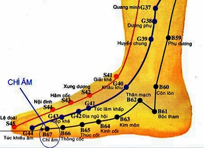 Cách châm cứu: Châm 0,1 tấc, mũi kim hướng theo bàn chân. Cứu 3-5 phút.