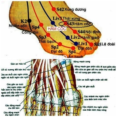 Giải phẫu: Dưới da là khe giữa các gân duỗi các ngón 2 và 3 của cơ duỗi dài và cơ duỗi ngắn các ngón chân, cơ gian cốt mu chân 2, khe giữa xương bàn chân 2 và 3. Thần kinh vận động cơ là các nhánh của dây thần kinh chày trước và nhánh của dây thần kinh chày sau. Da vùng huyệt chi phối bởi tiết đoạn thần kinh L5.